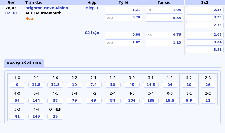 Theo kèo Châu Âu, việc chọn AFC Bournemouth thắng là một quyết định hợp logic. Dựa trên phong độ gần đây và lịch sử đối đầu, đội khách đang có sự tự tin vượt trội. Brighton & Hove Albion mặc dù được đánh giá mạnh hơn về tổng thể, nhưng những gì họ thể hiện không đủ thuyết phục để tạo nên bất ngờ trong trận đấu sắp tới. Ngược lại, AFC Bournemouth với lối chơi kỷ luật, sắc bén cùng phong độ cao hoàn toàn có cơ hội giành 3 điểm trọn vẹn.